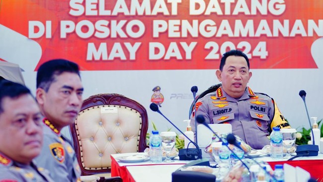 Kapolri Jenderal Listyo Sigit Prabowo memantau pengamanan aksi peringatan hari buruh internasional atau may day di Gelora Bung Karno (GBK). Sejumlah pejabat Mabes Polri turut mendampingi.