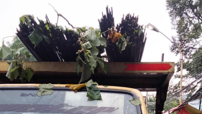 Pohon tumbang mengakibatkan truk yang mengangkut barang dari toko bangunan mengalami kerusakan. Dari foto yang diterima detikcom, kaca mobil bagian depan sebelah kiri pecah.