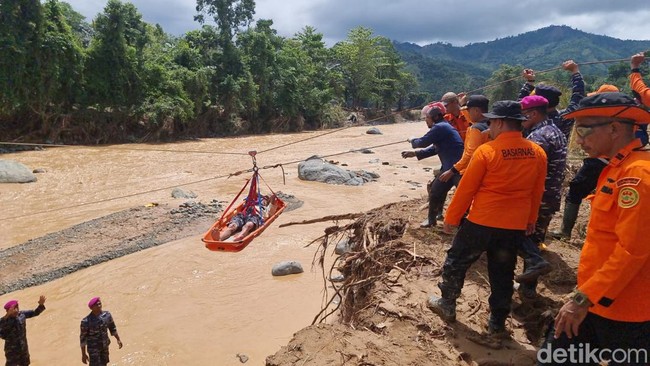 Tim Basarnas mengevakuasi warga di Desa Kaili, Kabupaten Luwu, Sulawesi Selatan (Sulsel) yang terjebak banjir dengan menggunakan metode flying fox untuk menyeberangi sungai. Terdapat 8 warga Desa Kaili yang dievakuasi, satu diantaranya merupakan lansia lumpuh.