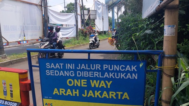 Polisi menerapkan sistem satu arah atau one way dari arah Puncak, Kabupaten Bogor, Jawa Barat, menuju Jakarta. One way diterapkan karena telah terjadi antrean kendaraan imbas one way ke arah Puncak.