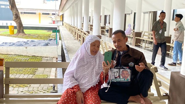 Pasangan kakek-nenek Misbah (62) dan Noneng (61) tampak menahan tangis saat melakukan video call dengan cucunya. Pasangan lansia ini akan berangkat ke Tanah Suci Makkah untuk menjalankan ibadah haji dini hari nanti.