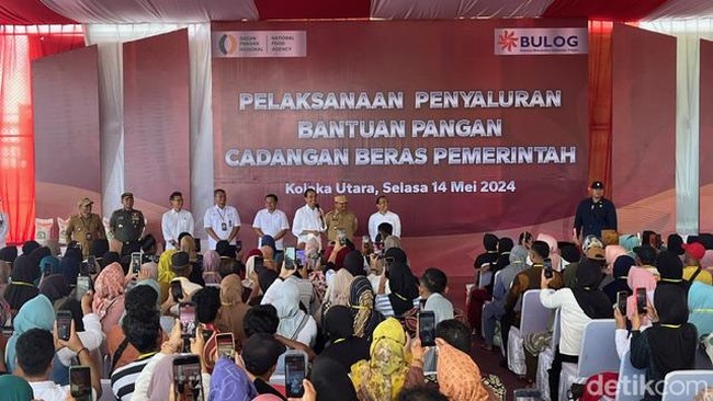 Presiden Joko Widodo (Jokowi) membagikan bantuan pangan beras 10 kg di Kolaka Utara, Sulawesi Tenggara. Di depan warga, Jokowi menjelaskan alasan pembagian beras tersebut.