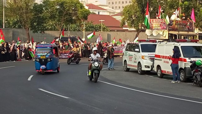 Massa menggelar Aksi Bela Palestina di depan Kedubes AS dan Kedubes Mesir, Jakarta Pusat. Sebanyak 1.648 polisi dikerahkan untuk mengamankan jalannya aksi.