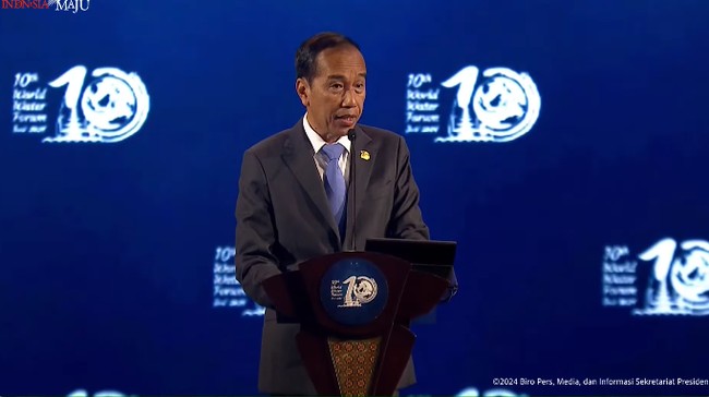Hal ini disampaikan Jokowi saat memberi sambutan dalam KTT WWF-ke 10 di Mangapura Hall BICC, Senin (20/5/2024). Jokowi awalnya menyampaikan kondisi 72 persen permukaan bumi yang tertutup air. Jokowi mengatakan hanya 1 persen yang bisa diakses untuk air minum dan keperluan sanitasi.