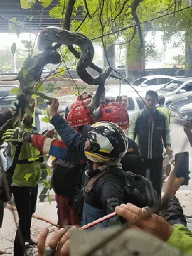 Terlihat anggota pemadam kebakaran (damkar) sudah menangkap bagian kepala sanca menggunakan alat. Kemudian anggota damkar lainnya berupaya menarik bagian buntut sanca yang melingkar di dahan pohon.