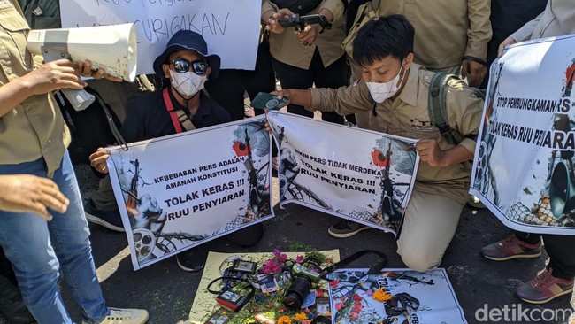 Jurnalis se-Malang Raya melakukan aksi demo di depan Balai Kota Malang. Unjuk rasa ini dilakukan sebagai bentuk sikap menolak revisi Undang-Undang (UU) Nomor 32 Tahun 2002 tentang penyiaran.