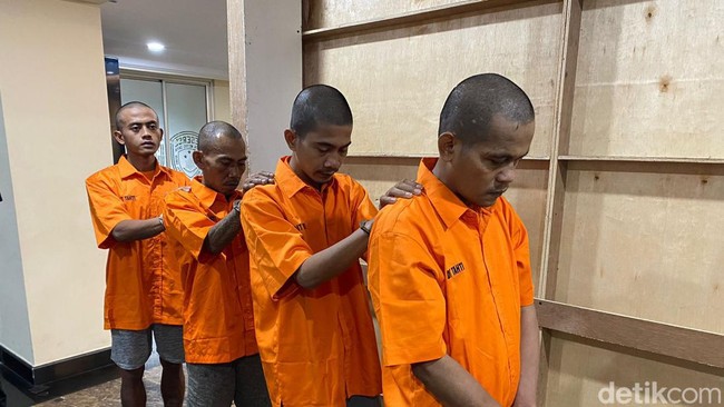 Pantauan detikcom, Rabu (22/5/2024), komplotan pelaku dihadirkan dalam jumpa pers di gedung Ditreskrimum Polda Metro Jaya. Para pelaku kini sudah mengenakan baju tahanan berwarna oranye lengkap dengan tangan terborgol.