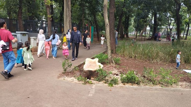 Pantauan detikcom di Tebet Eco Park, Minggu (26/5/2024), terlihat sejumlah warga masih menikmati area bermain anak atau children playground. Tak jauh dari children playground terdapat bekas pohon tumbang.