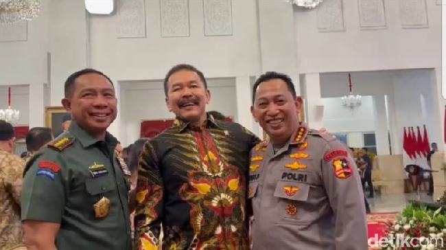 Kapolri Jenderal Listyo Sigit Prabowo, Jaksa Agung ST Burhanuddin, dan Panglima TNI Jenderal Agus Subiyanto memperlihatkan kekompakan seusai acara di Istana Negara. Ketiganya saling rangkul penuh tawa.