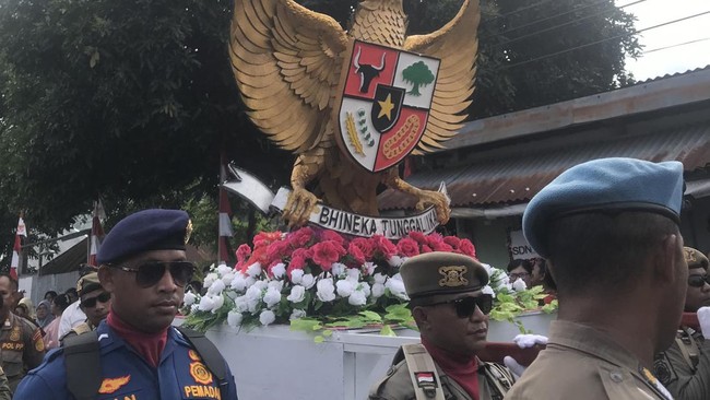 Marching band saling bersahutan mengawal replika Burung Garuda dengan 5 perisai berkeliling di desa mereka. Lantunan lagu Garuda Pancasila terdengar dalam parade ini.