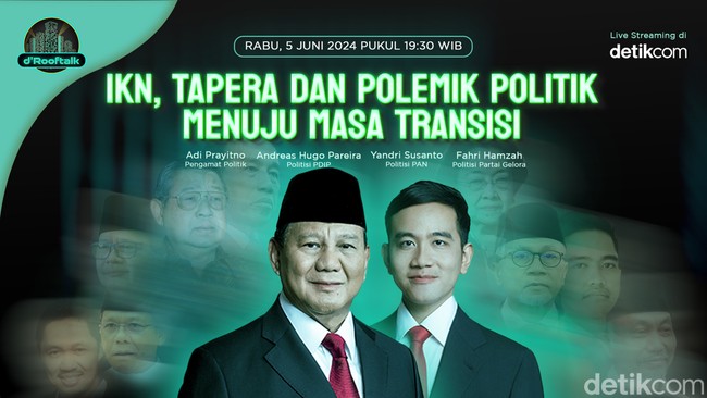 d'Rooftalk malam ini akan mengulas secara lengkap mengenai lanskap politik terkini dalam tema 'IKN, Tapera dan Polemik Politik Menuju Masa Transisi'. Topik tersebut dibahas bersama oleh Andreas Hugo Pareira (Politikus PDIP), Yandri Susanto (Wakil Ketua Umum PAN), Fahri Hamzah (Wakil Ketua Umum Partai Gelora), dan Adi Prayitno (Akademisi Politik UIN). Acara disiarkan secara langsung pada Rabu, 5 Juni 2024, pukul 19.30 WIB, di detik.com, 20detik.com, dan seluruh media sosial detikcom.