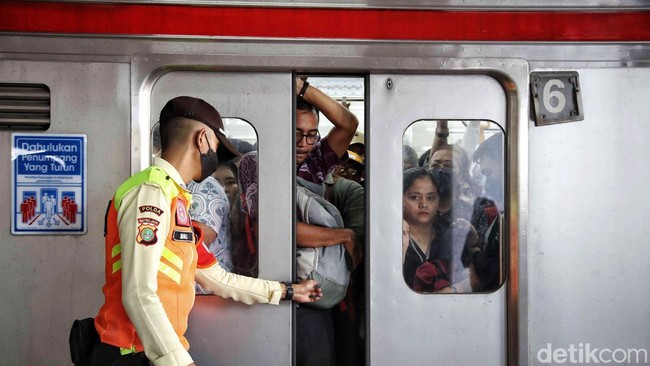Petugas pun terlihat mendorong penumpang agar pintu kereta bisa tertutup. Salah satu penumpang, Helen (27), mengatakan suasana di dalam kereta saat ini semakin sesak karena kebanyakan kereta yang beroperasi hanya 8 rangkaian.