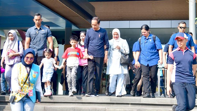 Presiden Joko Widodo (Jokowi) bersama Ibu Negara Iriana mengajak cucu Jan Ethes dan La Lembah Manah ke Taman Mini Indonesia Indah (TMII). Jokowi menghabiskan waktu bersama dengan menikmati keberagaman budaya Indonesia