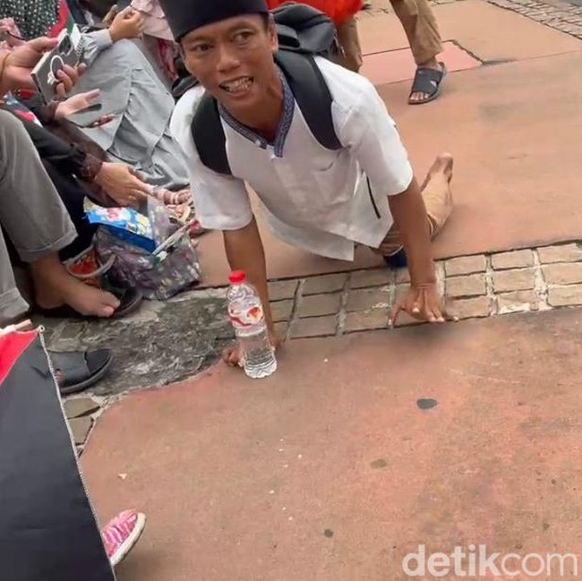 Seorang pria bernama Egi asal Rangkasbitung, Banten, ikut aksi membela Palestina bersama teman-temannya di kawasan Monumen Nasional (Monas), Jakarta Pusat (Jakpus), hari ini. Dengan keterbatasannya, Egi ikut aksi bela Palestina.