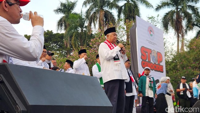 Mantan Ketua Umum PP Muhammadiyah, Din Syamsuddin menghadiri aksi bela Palestina di Kawasan Patung Kuda, Jakarta Pusat. Dia mendorong Indonesia mengirim bantuan militer ke Palestina untuk menghentikan Israel.