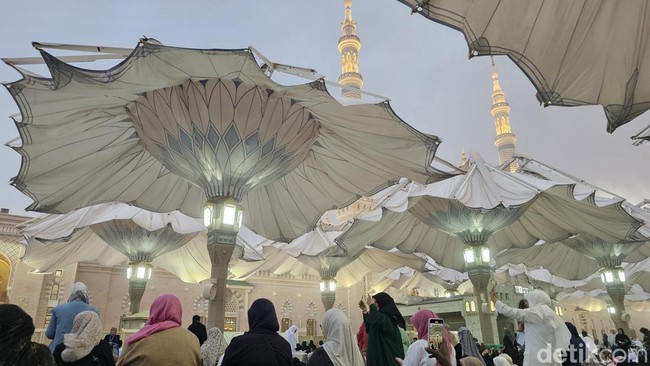 Payung konvertibel ini terpasang kokoh di tiang-tiang halaman Masjid Nabawi. Terdapat dua kipas besar yang menyemprotkan air di tiang payung tersebut.