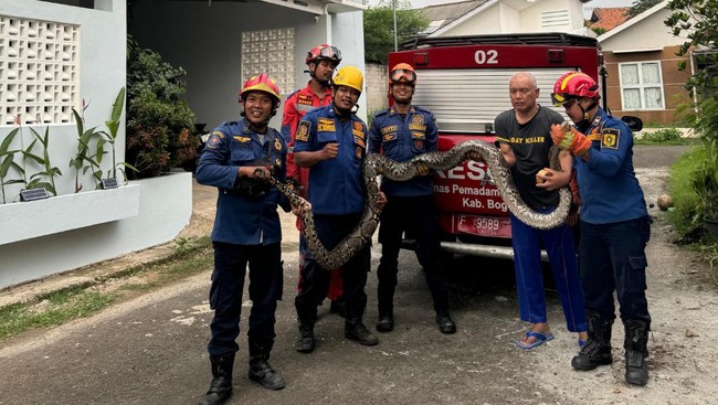 Ular sanca sepanjang 4 meter muncul di permukiman warga, Sukahati, Kecamatan Cibinong, Kabupaten Bogor, Jawa Barat (Jabar). Pemadam kebakaran Kabupaten Bogor yang mendengar hal tersebut langsung mengerahkan personel untuk mengevakuasi ular.