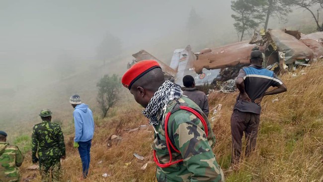 Foto-foto yang dibagikan kepada AFP oleh seorang anggota tim penyelamat militer menunjukkan para personel militer berdiri di lereng berkabut dekat puing-puing yang memuat nomor registrasi pesawat militer Malawi, Dornier 228-202K.