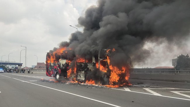 Satu unit bus pariwisata terbakar di Tol Wiyoto Wiyono arah Tanjung Priok, Jakarta Utara, pagi tadi. Bus tersebut mengangkut 54 orang.