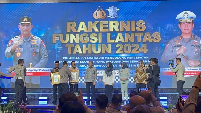 Penghargaan diberikan dalam acara Rapat Kerja Teknis (Rakernis) fungsi lalu lintas 2024 di Alana Hotel & Convention Center, Yogyakarta, Rabu (12/6/2024). Penghargaan diberikan oleh Kapolri Jenderal Listyo Sigit Prabowo.