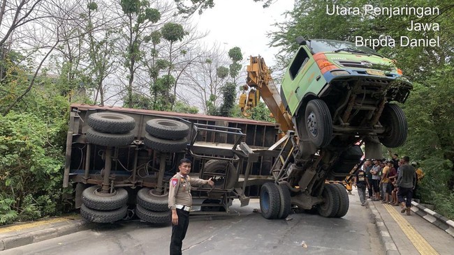 Satu unit truk kontainer di Penjaringan, Jakarta Utara, terlibat kecelakaan hingga peti kemasnya terguling menimpa mobil Hyundai dan membuat pengemudinya terjepit. Polisi mengungkap penyebab kecelakaan lalu lintas tersebut.