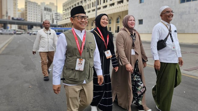 Cak Imin ditemani istri dan Wakil Ketua Komisi VIII DPR RI Marwan Dasopang berjalan kaki mengecek ke tiga pemondokan yang berada di Misfalah, Arab Saudi, pada Jumat (14/6/2024). Cak Imin bergerak dari lokasi penginapan di Makkah ke Misfalah mulai pukul 06.45 WIB.