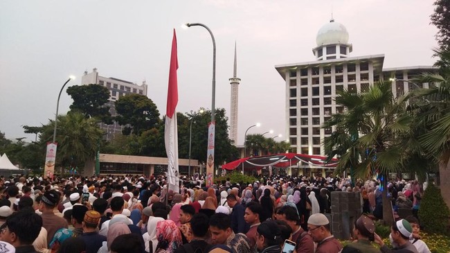 Jamaah salat Idul Adha di Masjid Istiqlal mulai berdatangan. Antrean panjang masuk ke Masjid Istiqlal pun terlihat.