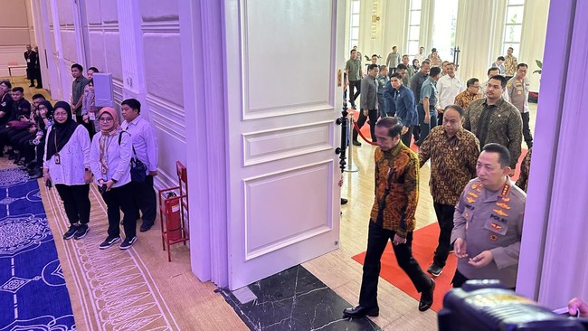 Pantauan detikcom, Senin (24/6/2024), Jokowi tiba di lokasi pukul 08.38 WIB. Kedatangan Jokowi didampingi oleh sejumlah pejabat.