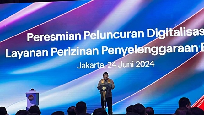 Hal itu disampaikan Sigit dalam sambutannya di acara grand launching layanan perizinan penyelenggara event di The Tribrata, Jakarta Selatan, Senin (24/6/2024). Peresmian digitalisasi layanan perizinan itu dihadiri oleh Presiden Joko Widodo (Jokowi) dan jajaran menteri Kabinet Indonesia Maju.