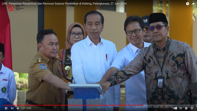 "Dengan mengucap bismillahirrahmanirrahim, pada pagi hari ini saya resmikan pembangunan rehabilitasi dan renovasi sarana dan prasarana pendidikan di Kalimantan Tengah," tutur Jokowi.