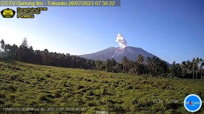 Gunung Api Ibu di Halmahera, Maluku Utara, erupsi dengan tinggi kolom letusan 5 kilometer. Pusat Vulkanologi, dan Mitigasi Bencana Geologi (PVMBG) meminta warga untuk tak beraktivitas di puncak Gunung Ibu.