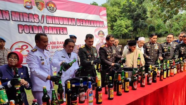 Pantauan detikcom, Senin (1/7/2024), Kapolda Banten Irjen Abdul Karim bersama Pj Gubernur Al Muktabar dan jajaran Forkopimda memusnahkan miras tersebut. Pemusnahan miras ini dilakukan di Lapangan Tembak Polda Banten, Jalan Syekh Nawawi Al Bantani.