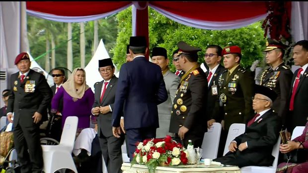 Jokowi kemudian menyapa Menhan sekaligus presiden terpilih, Prabowo Subianto. Tampak Prabowo berdiri sambil memberi hormat kepada Jokowi.
