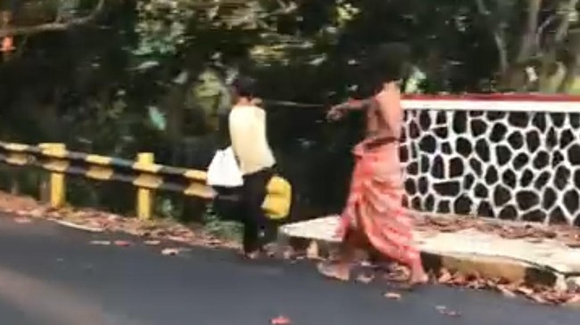 Selain momen saat korban diduga diikat dan dituntun pelaku, ada juga momen yang memperlihatkan keduanya bersama di halaman sebuah toko swalayan. Dalam rekaman video yang juga tersebar di publik, terlihat sang terduga pelaku memegangi pakaian korban. Korban tampak bergeming saat dipegangi pelaku.