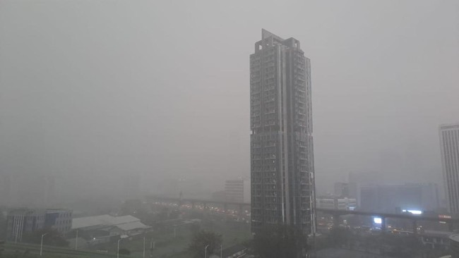 Kondisi hujan dan angin kencang membuat pandangan mata terbatas. Dari lantai sembilan sebuah gedung, kondisi DKI Jakarta seperti diselimuti kabut.