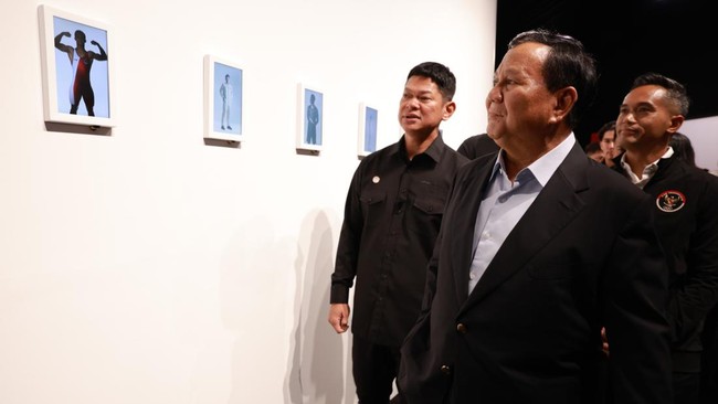 Saat tiba, Prabowo sempat menyapa para tamu undangan yang hadir kemudian secara bersama-sama melihat desain 'Jersey Merah Putih' yang didesain oleh putranya, Didit Hediprasetyo.