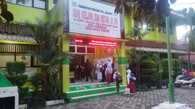 Pantauan detikcom di SD Negeri 01 Kelapa Dua Wetan, Ciracas, Jakarta Timur (Jaktim), Senin (8/7/2024), para orang tua mulai berdatangan ke sekolah mulai pukul 06.00 WIB. Kebanyakan dari mereka mengantar anaknya menggunakan sepeda motor.