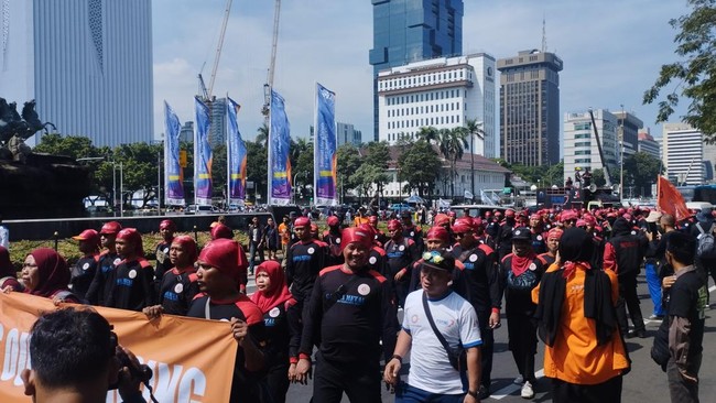 Partai Buruh dan Aliansi Buruh menggelar demonstrasi di kawasan Patung Kuda, Jakarta Pusat. Polisi pun menutup Jalan Medan Merdeka Barat arah Istana karena ada demo tersebut.