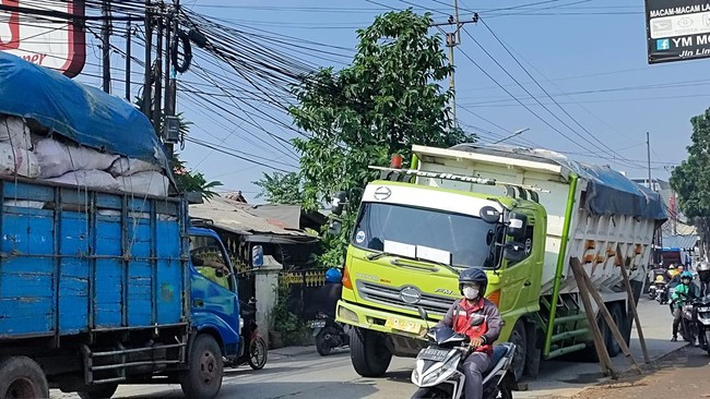 Truk yang patah as roda itu berada di tengah jalan. Kondisi ini menyebabkan mobil-mobil menuju Limo dan Pangkalan Jati macet parah.