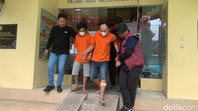 Keduanya tampak mengenakan masker. Mereka tidak mengucapkan kata-kata saat digiring anggota kepolisian ke lokasi konferensi pers di Polsek Grogol Petamburan.