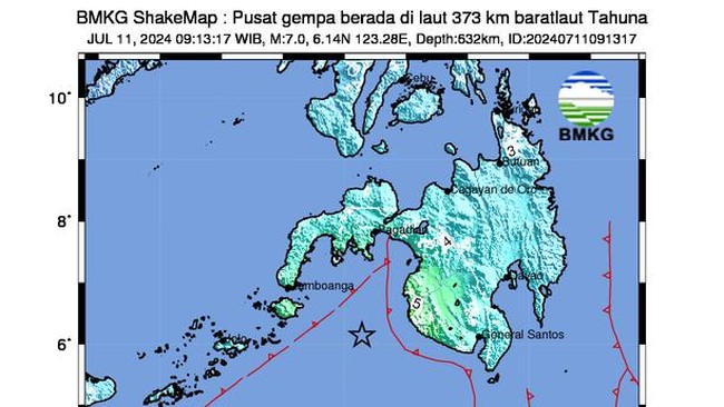 "Parameter Gempabumi, 11/07/2024 - 09:13:17 WIB. Magnitudo 7. Kedalaman 632 Km. Lokasi 6.14 LU 123.28 BT. Pusat gempa berada di laut 373 km barat laut Tahuna," demikian keterangan resmi yang dikutip dari laman BMKG, Kamis (11/7/2024).