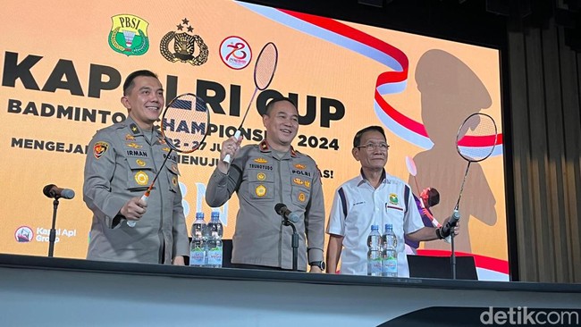 Polri menggelar turnamen bulutangkis bertajuk 'Kapolri Cup Badminton Championship 2024'. Polri menggandeng PP PBSI untuk menggelar kegiatan dalam rangka perayaan Hari Bhayangkara ke-78.