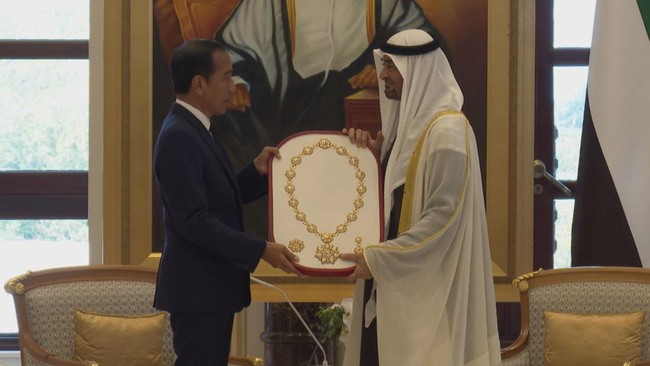 MBZ memberikan langsung penghargaan tersebut ke Jokowi usai pertemuan bilateral dilakukan. Order of Zayed merupakan penghargaan sipil tertinggi dari UEA untuk tokoh-tokoh dunia.