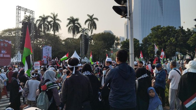 Pantauan detikcom di lokasi, Minggu (21/7/2024), pukul 07.27 WIB terlihat massa mulai berdatangan menggunakan atribut bergambar bendera Palestina seperti syal hingga ikat kepala.