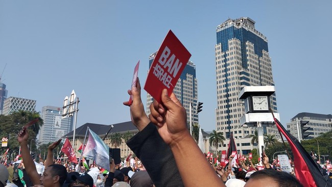 Pantauan detikcom di lokasi, Minggu (21/7/2024) pukul 09.07 WIB terlihat massa meniup peluit dan mengangkat kartu merah. Teriakan 'Boikot Israel' hingga 'Free Palestine' terdengar dari massa yang mengikuti aksi. Terlihat massa juga mengibarkan bendera Palestina dan Indonesia.