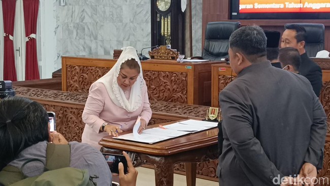 Pantauan detikJateng di Gedung DPRD Semarang, Senin (22/7/2024), Mbak Ita hadir di ruangan paripurna pukul 11.55 WIB. Dia terlihat mengenakan pakaian berwarna merah muda dengan kerudung putih.
