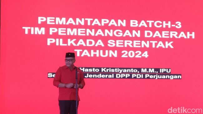 Hal itu disampaikan Hasto dalam acara 'Pemantapan Batch 3 Tim Pemenangan Daerah Pilkada Serentak Tahun 2024' di Hotel Seruni, Bogor, Jawa Barat. Hasto mulanya menyampaikan semangat juang dari Ir Soekarno yang mesti dipedomani oleh kader PDIP.