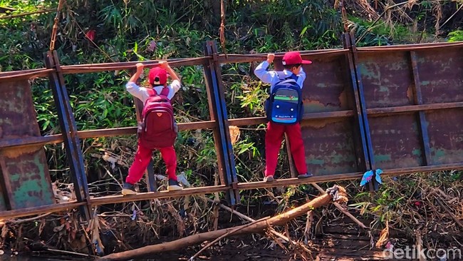 "Kalau sekolah suka lewat sini, jalannya (gelantungan), nggak takut. Setiap hari lewat sini, kalau hujan ya nggak sekolah," tuturnya terbata-bata saat ditanya awak media.