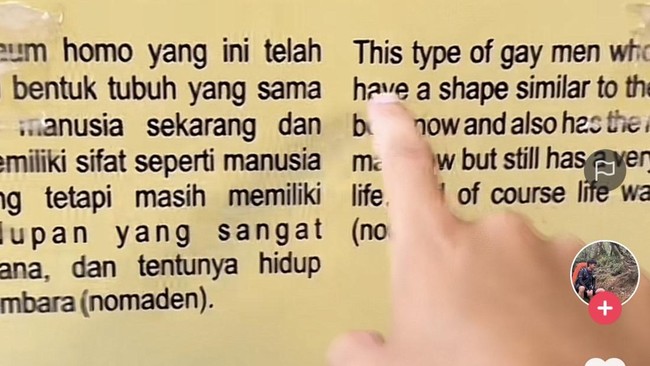 Video diunggah akun tiktok @Anandabhuwana. Dilihat detikSumut pada Rabu (24/7/2024), pemilik akun menyoroti papan edukasi tentang Homo sapiens yang ada di dalam museum, manusia purba ini ditulis dalam bahasa Indonesia sebagai 'jenis kaum homo' dan dalam bahasa Inggris diterjemahkan dengan 'gay men'.