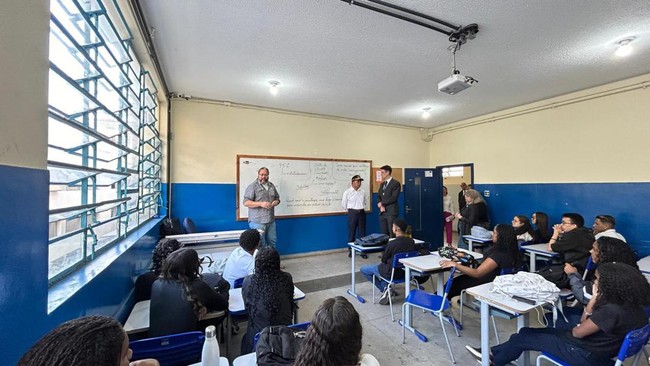 Muhadjir disambut Kepala Sekolah Andrea Montalvao dan para siswa saat mengunjungi Colegio Estadual Souza Aguiar. Muhadjir berdialog bersama mereka kemudian meninjau dapur dan ruang kelas di sekolah tiga lantai tersebut.